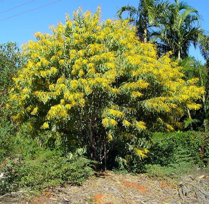 Highly variable shrub or small tree. Distinct powdery whitish bark, bold blue-green crescent moon shaped leaves and profusions of bright yellow cylindrical flowers. Hardy and fast growing specimen ideal for borders and screening. Prefers full sun. 2-6M