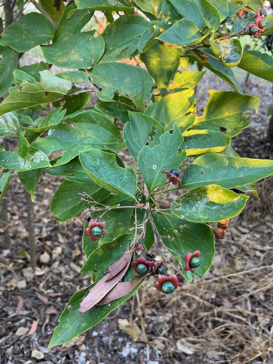 Colourful ornamental small shrub with bursts of showy white tubular fragrant flowers and colourful dark purple fruits in star shaped cup. Excellent filler for garden beds and screening. Butterfly attractant. More Information. 1-3M