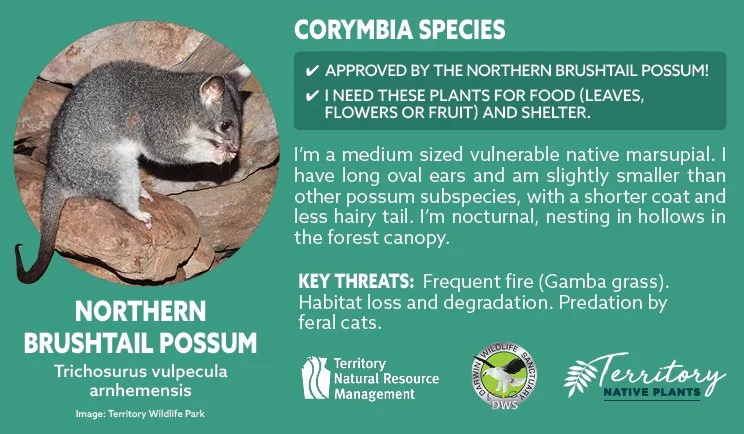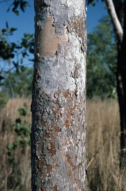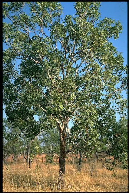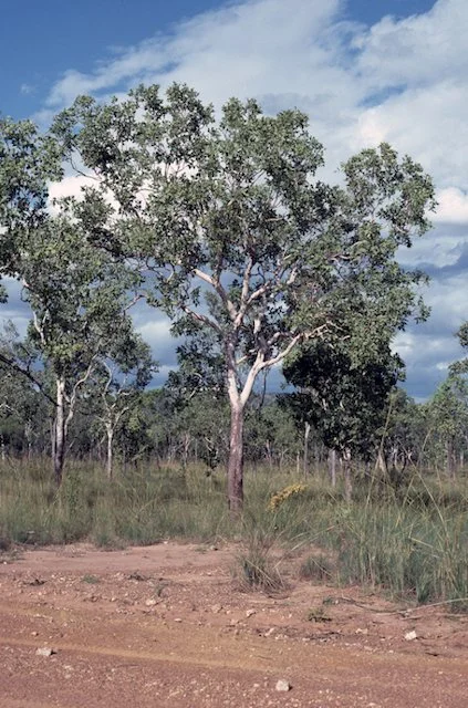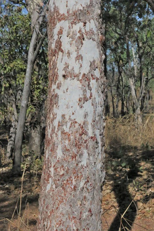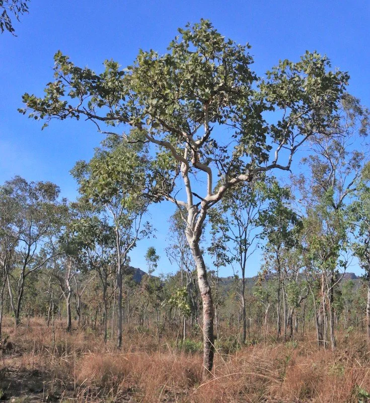 Small Top End bloodwood with large spreading shade canopy and incredibly showy clusters of large cream flowers. Colourful red-brown bark on lower trunk transitioning to smooth white upper branches. Widely found across open woodland on sandy to gravely soils and open plains. Forms a lignotuber. Partly deciduous in dry season. 7-10M