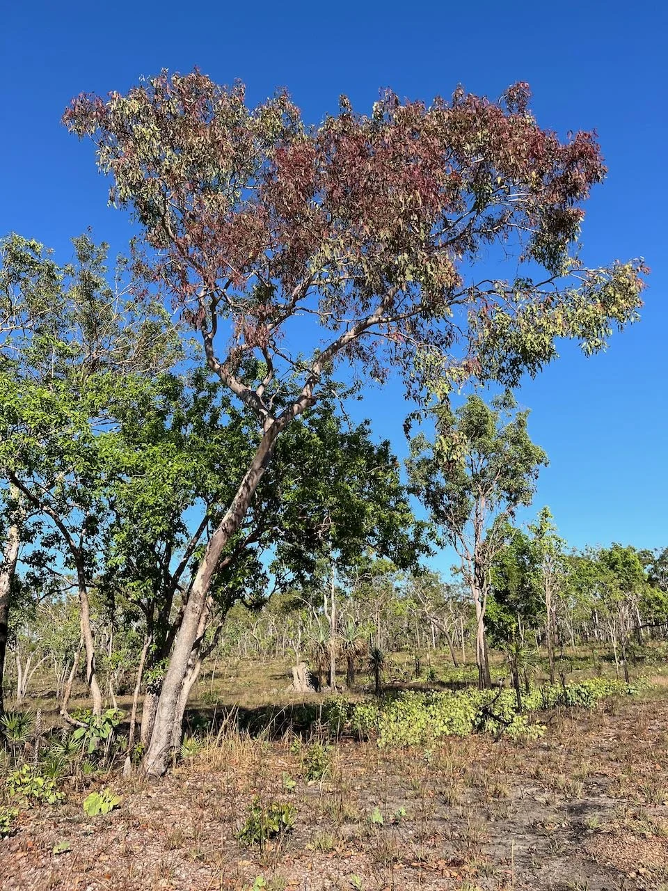 Widespread ghost gum featuring impressive and distinctive bright red/maroon flush of new foliage mid dry season. Distinctly tessellated stocking of rough bark on lower trunk with smooth white bark above. 10-15M