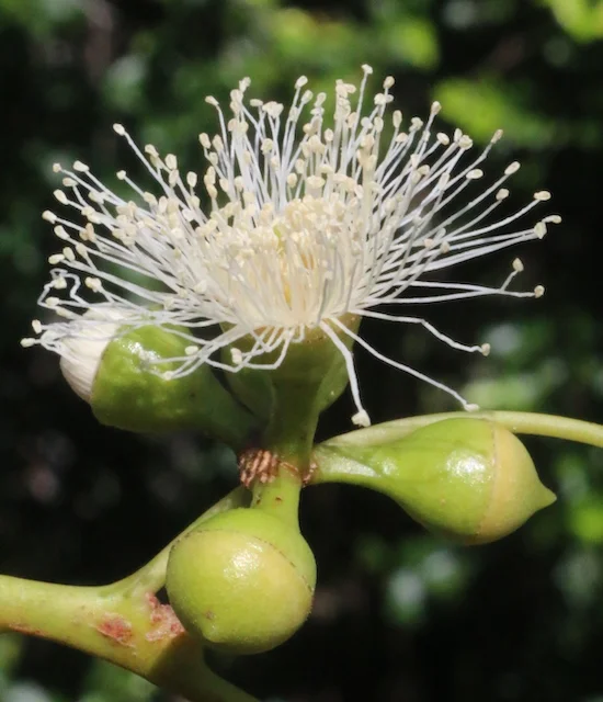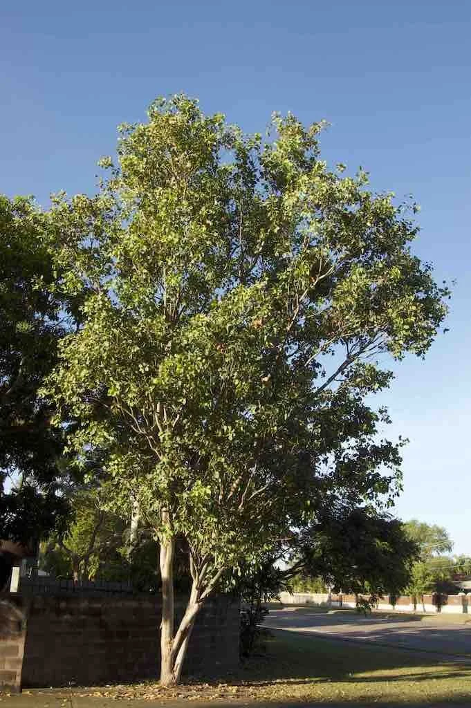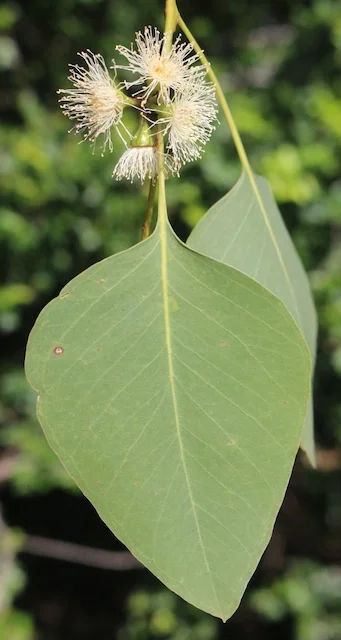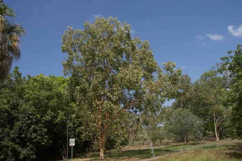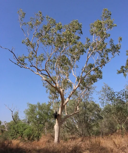 Attractive large Top End salmon gum with enormous triangular leaves, white grey bark shedding to brilliant salmon-pink and profuse bursts of white flowers. Similar to E.tintinnans but with larger form & much larger leaves. 10-20M