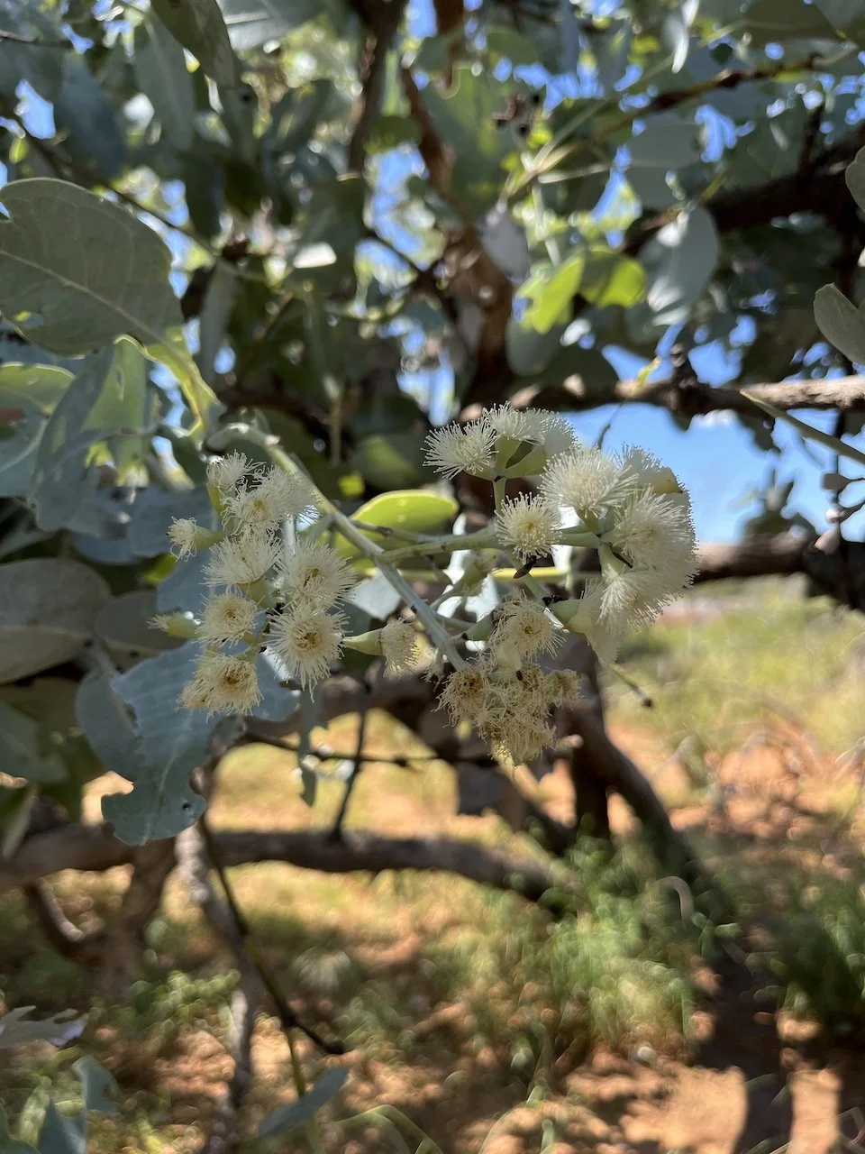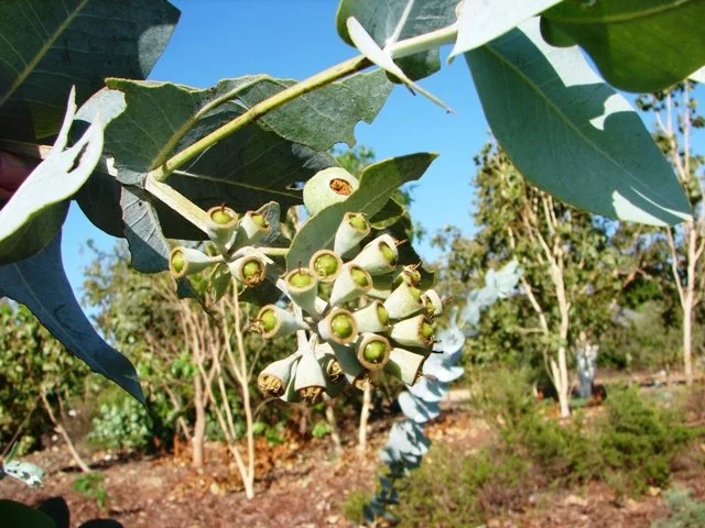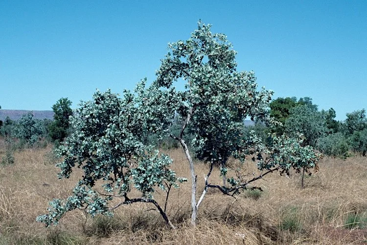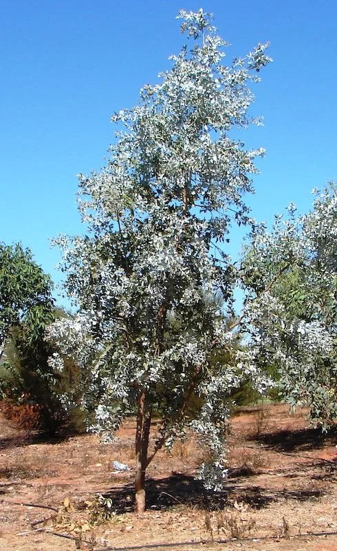 Spectacular small-medium gum tree from mid-north NT with distinctive bright silvery/white to blue/green foliage and bursts of creamy white flowers. Very hardy. Multi stemmed mallee in harsh conditions. Excellent feature planting in native gardens for its bold, unique & decorative colouring. Endemic to Northern Australia. 8-10M