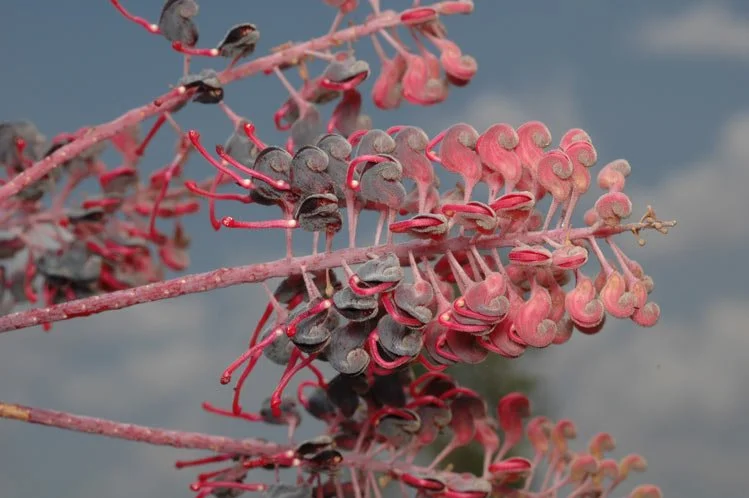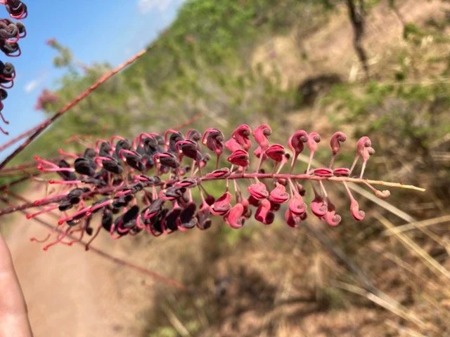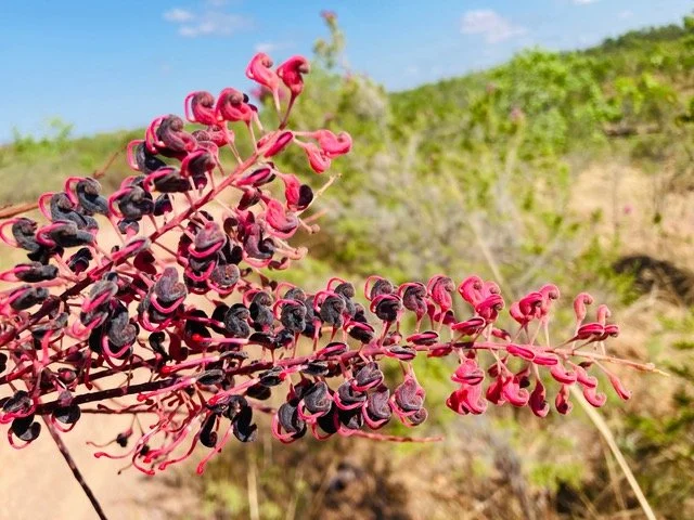 Very rare, near threatened NT endemic Grevillea restricted to the Daly River basin and Fergusson Range. Ornate hardy feature garden planting with stunning reddish flowers that turn black upon ripening. Found on rocky slopes in open woodland. Prefers full sun & good drainage. Highly sought after in parks and gardens. 2–4M