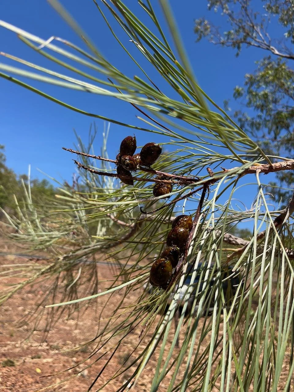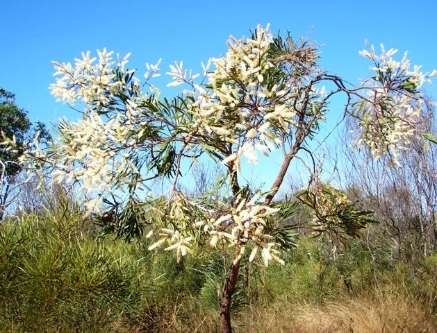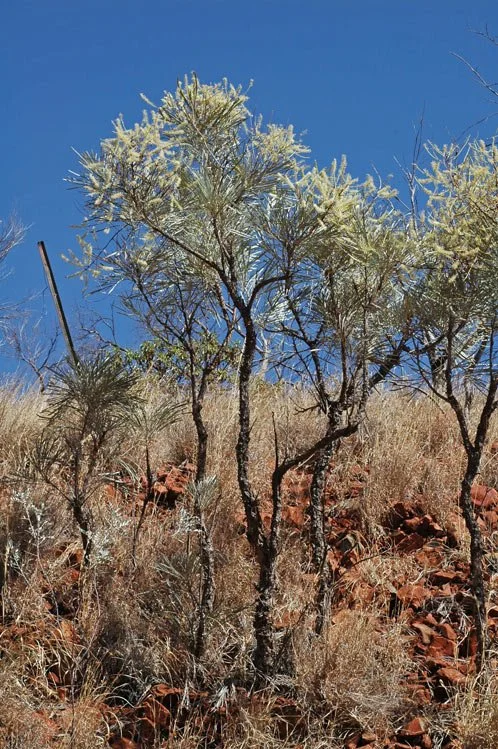 Small tree or shrub with slender cream flowers forming spectacular pyramids at the ends of branches. Unique corky, grey and fissured bark, revealing red underneath. Narrow pendulous silver-grey leaves. Prefers sandy or gravelly well-drained soils in full sun. A rare and striking feature grevillea for gardens and rockeries. Handle with care; toxic seed coating burns skin. More information here. 3-5M