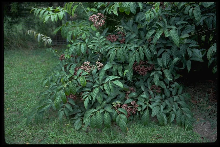 Hardy, vigorous, very fast growing and colourful large garden shrub. Excellent screening and hedging specimen for fence lines. Attractive dark green foliage and showy masses of red to black fruits. Well-known pioneer species, formerly Leea indica. 1-4M