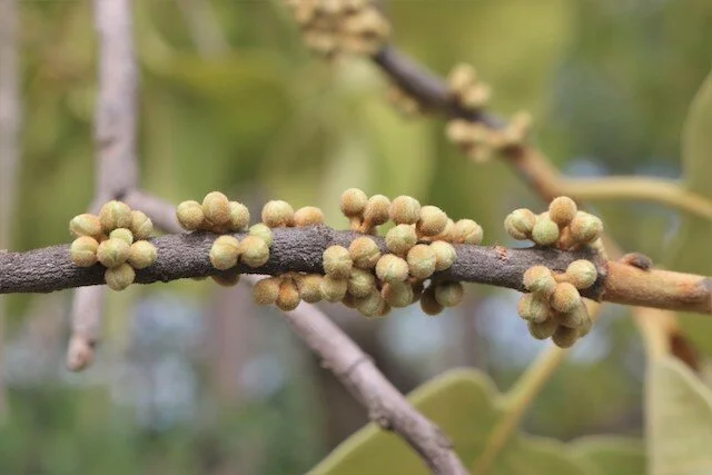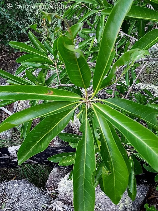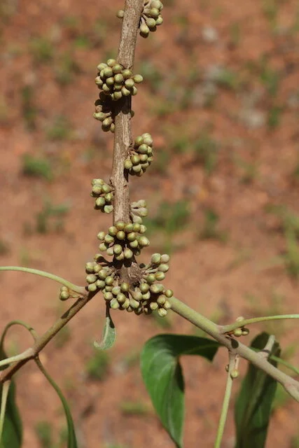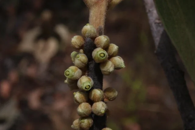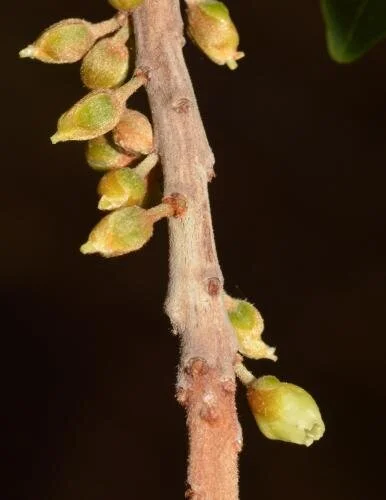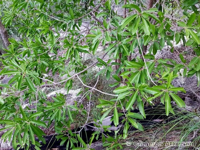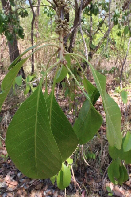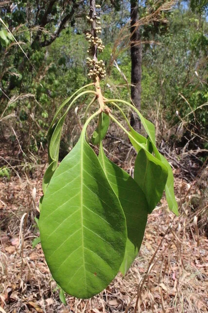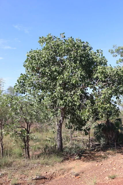 Semi-deciduous understory tree found in dry open forest, woodland and occasionally closer to freshwater. Smooth fleshy green or black globular edible berry eaten ripe or roasted. Small creamy white flowers. Corky greyish brown bark. An excellent bush tucker planting for suburban and rural properties, provided ample moisture. More information. 8-10M
