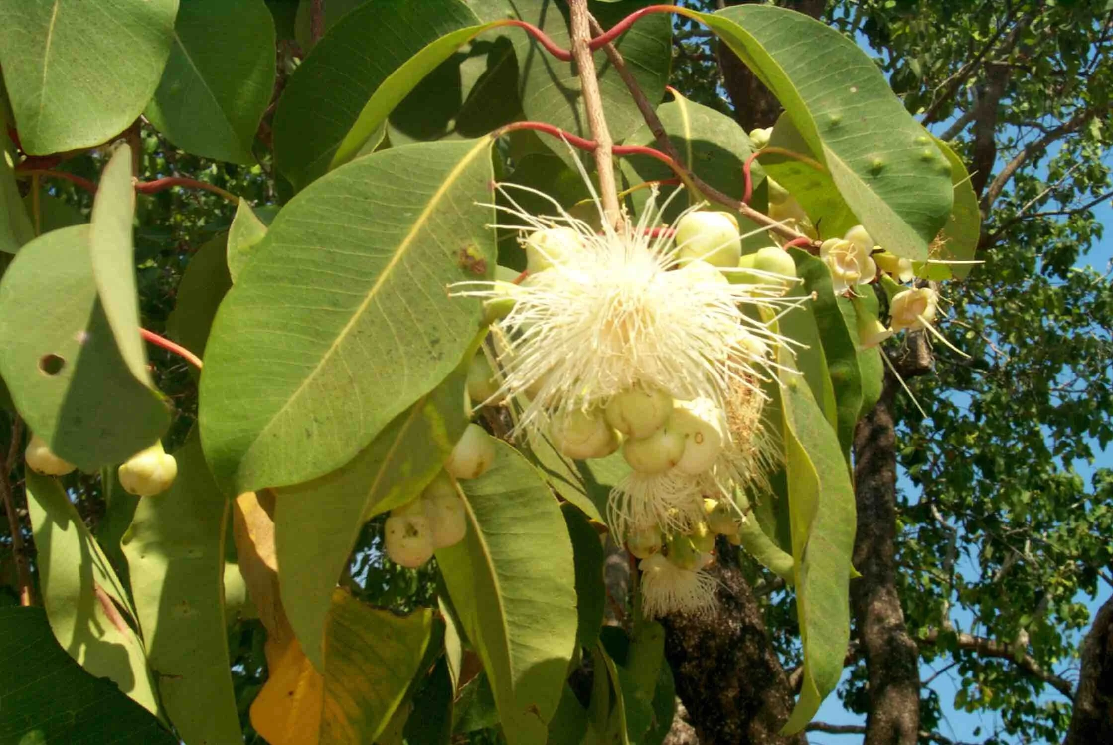 Handsome evergreen medium shade tree with bursts of large white flowers. Sweet apple like fruit eaten when pink and ripe. Very tasty compared to other Bush Apples, Pinyama is one of the most highly regarded Tiwi bush tucker foods. More information. 10-12M