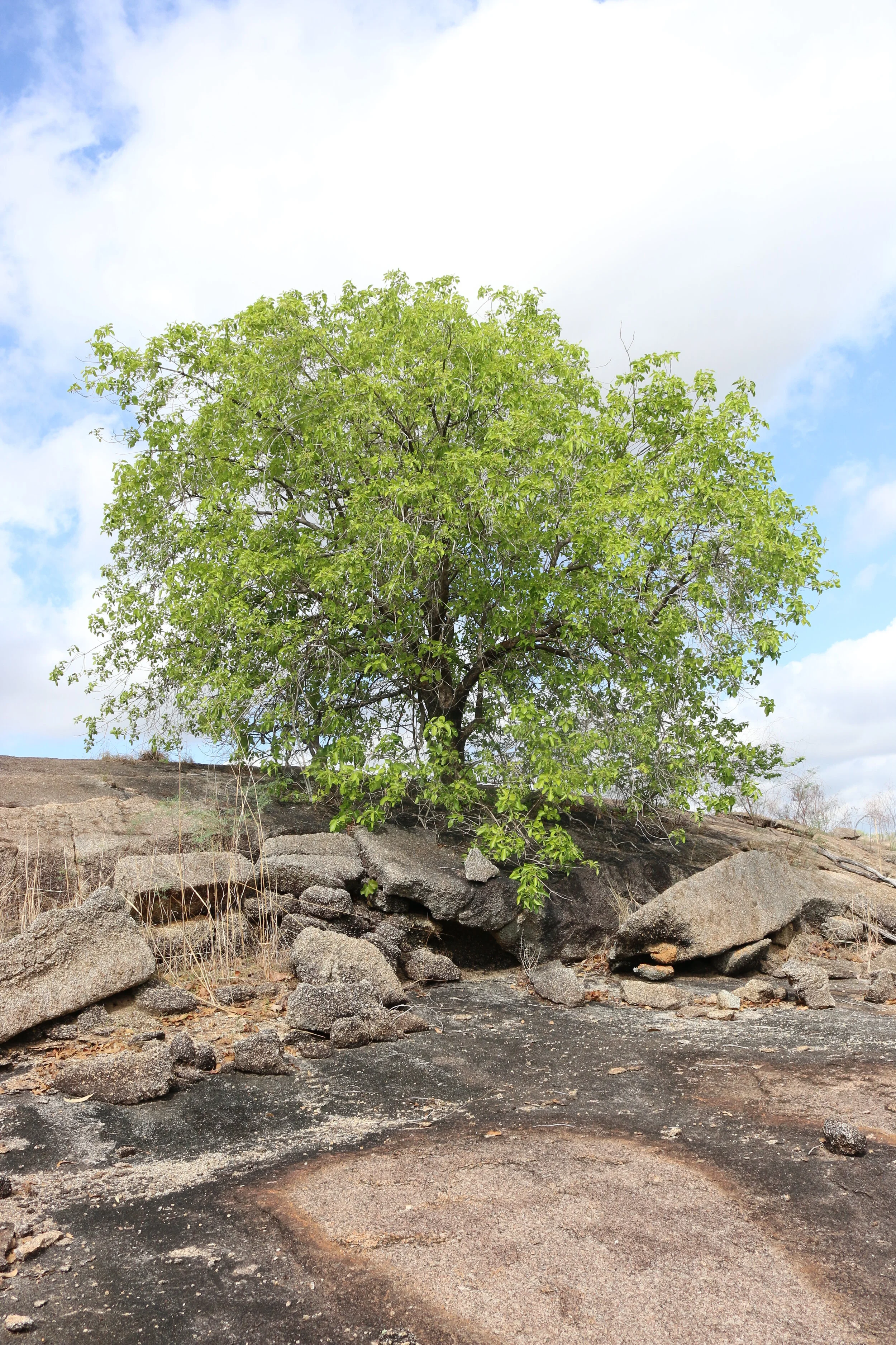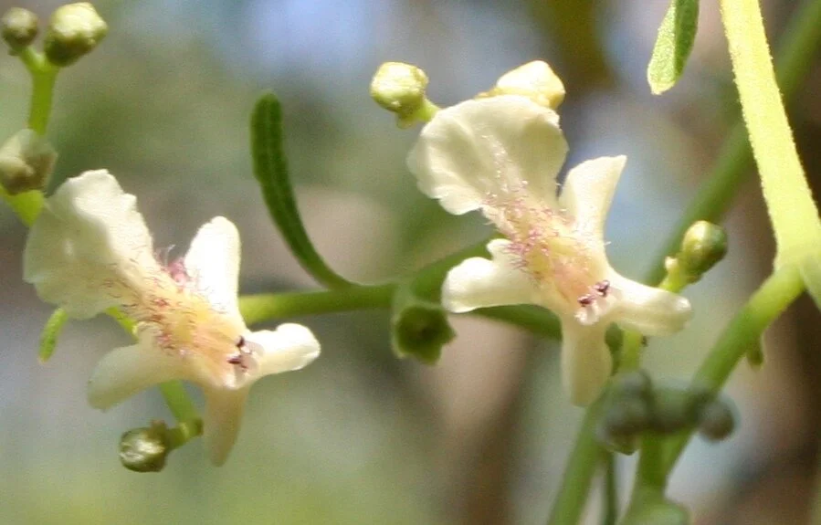 Moderate-sized hardy & spreading semi-deciduous shade tree. Unique tubular orchid-like cream flowers with mauve-purple throat. Highly regarded smooth sweet edible fleshy berries eaten raw, cooked or dried. Important host tree for Native Hawk Moth. Excellent parkland, coastal, monsoon forest & open forest woodland planting. Aboriginal Plant Knowledge. Can be larger but generally 7-12M